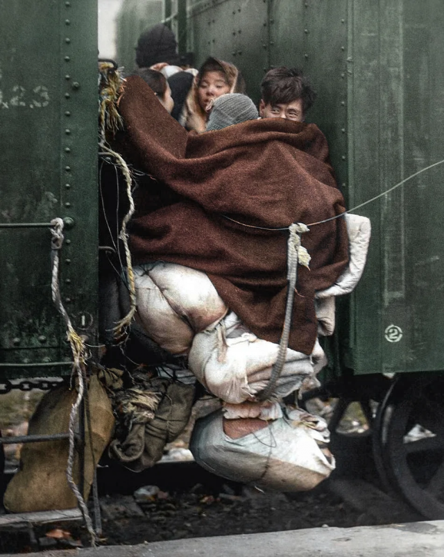 Семья вынужденных переселенцев ютится между товарными вагонами в Синмаке. Северная Корея, 1950 год.