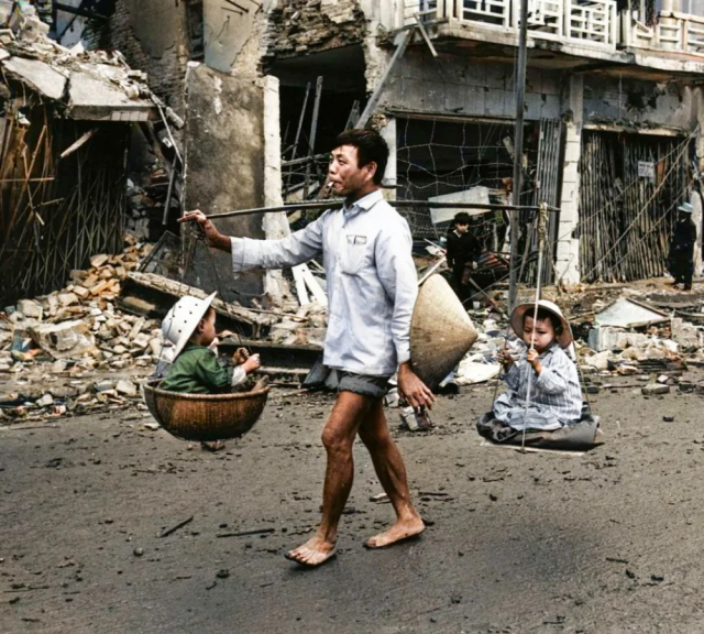 Вьетнамский беженец с детьми возвращается в разрушенный войной Хюэ, 1968 год.