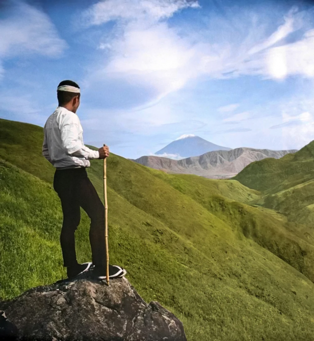 Японец смотрит на пик священной горы Фудзияма, 1930 год.
