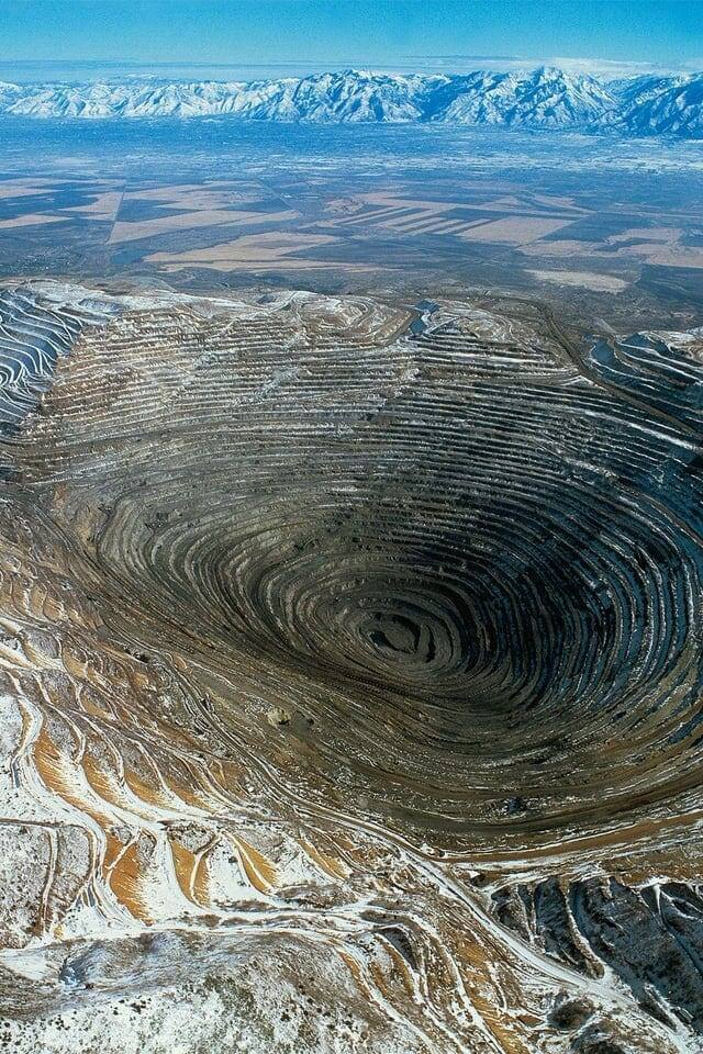 Перед вами старый медный рудник диаметром 2,7 километра и глубиной более 500 метров. Когда он закрылся, насосы, отбиравшие воду, были остановлены. В результате на месте ямы образовалось озеро.