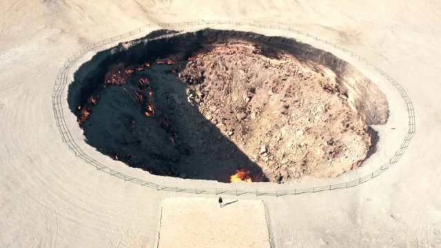 Это газовый кратер, который непрерывно горит с 1971 года. Его диаметр составляет 60 метров, а глубина 20.
