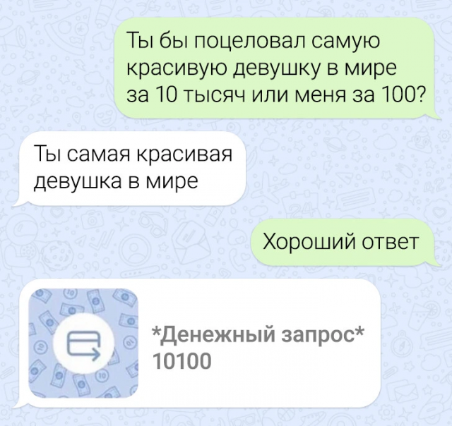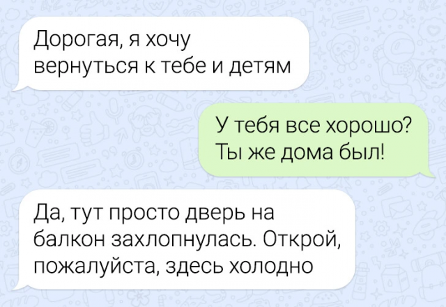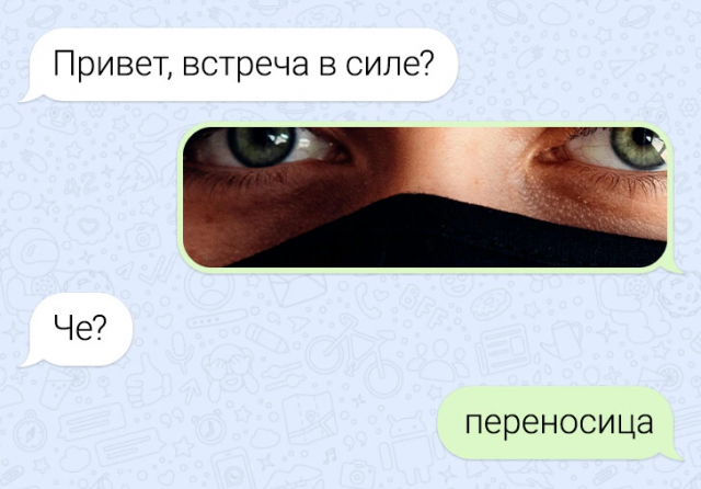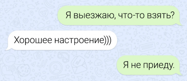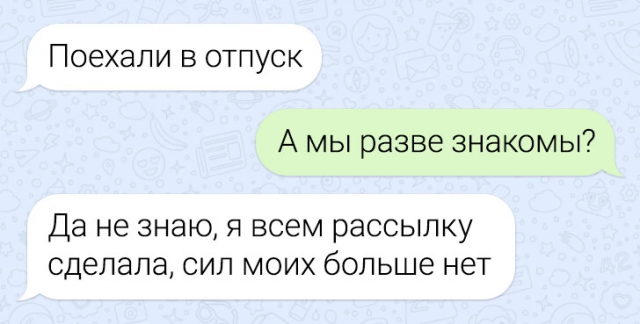 Забавные переписки, которые подняли настроение 06/03/2025 23:00 Иногда так интересно заглянуть в чужие чаты и посмеяться над их содержанием. Мы собрали лучшие забавные переписки, чтобы поднимить вам настроение. Главная / Картинки 0 Admin 0 170