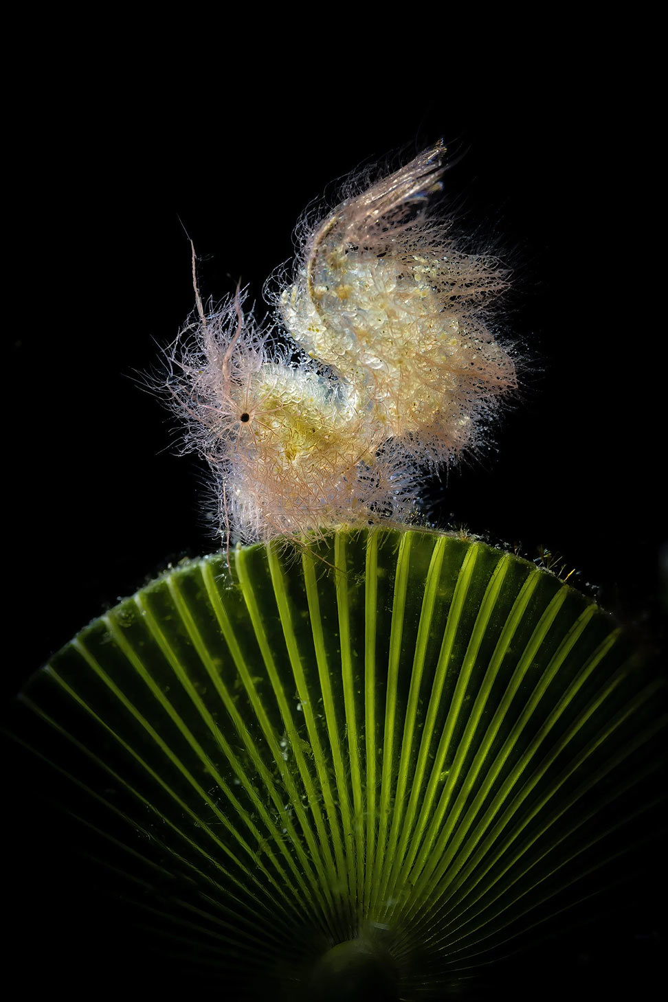 В конце этого погружения я заметил пару подводных фотографов, сосредоточенных на съемке, и это разожгло мое любопытство относительно того, что они фотографируют. Поняв, что это один из моих любимых объектов, волосатую креветку, я терпеливо ждал своей очереди и использовал это время, чтобы спланировать и подготовиться к съемке. Я решил снять ее в профиль, использовав контровой свет. (Фото Паоло Бондаски, Италия):