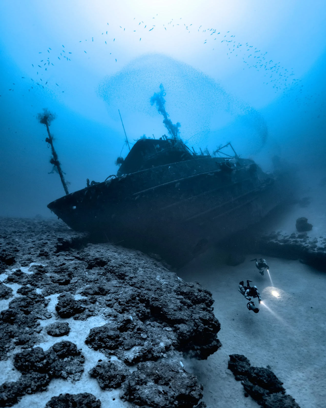 Затонувший корабль находится на рифе на глубине около 104 м. Когда он затонул, он застрял между стеной рифа и небольшим рифом, так что под затонувшим кораблем можно проплыть. Мы провели 25 минут на дне и около 2,5 часов в декомпрессионном режиме, чтобы сделать этот снимок. (Фото Алекс Доусон, Швеция):