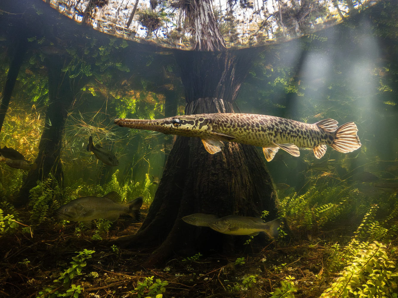 Я сделал этот снимок в одном из моих любимых мест в экосистеме Эверглейдс. Исторически я в основном нырял в соленой воде, но меня очаровала эта зловещая среда с чистой водой, светом, пробивающимся сквозь кипарисы, и видами рыб, как местных, так и интродуцированных. Я много раз возвращался в это место, пытаясь запечатлеть разные объекты и правильное освещение.