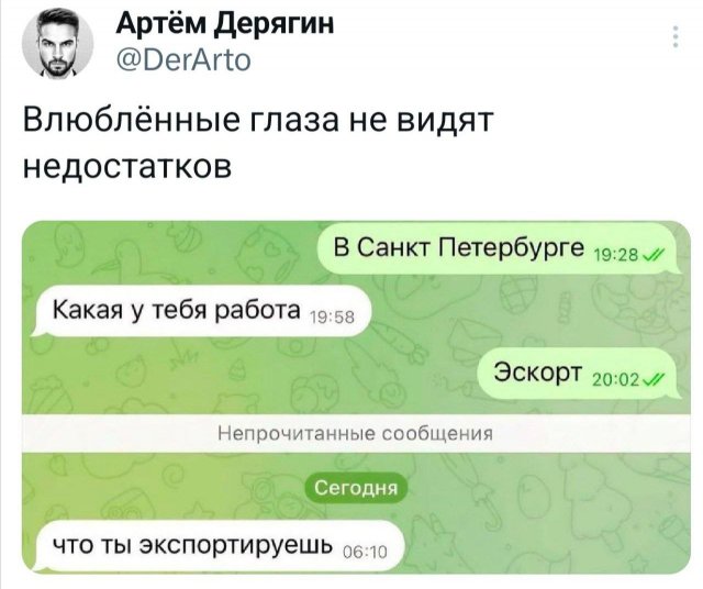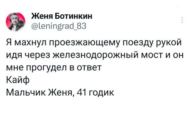 Свежая подборка забавных твитов 13/03/2025 14:00 Ловите новую коллекцию веселых твитов! Отличный повод сделать небольшой перерыв и зарядиться позитивом. Присоединяйтесь к просмотру — гарантируем отличное настроение! Главная / Картинки +1 Admin 0 242
