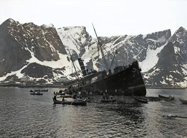 Пароход «Mercur» на мели в Тронхеймском фьорде. Норвегия, 1919 год.