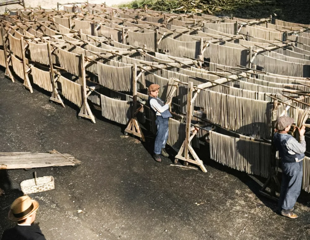 Макароны по-итальянски. Сушка под итальянским солнцем на стеллажах, 1955 год.
