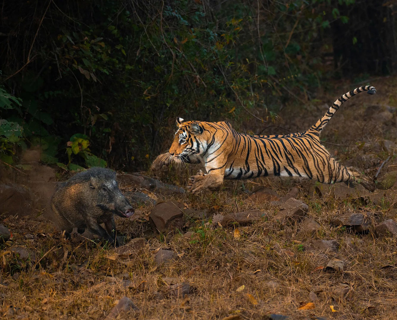Тигрица нападает на кабана. (Фото Anirudh Laxmipathy):