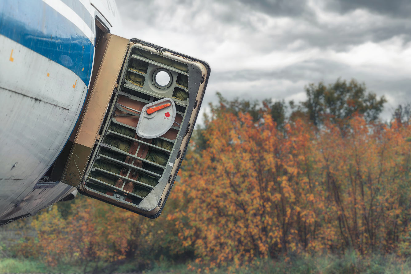 По бокам самолёта видны проемы аварийных боковых выходов только уже без крышек. Рядом с правой входной дверью лежит снятая крышка бокового аварийного выхода: