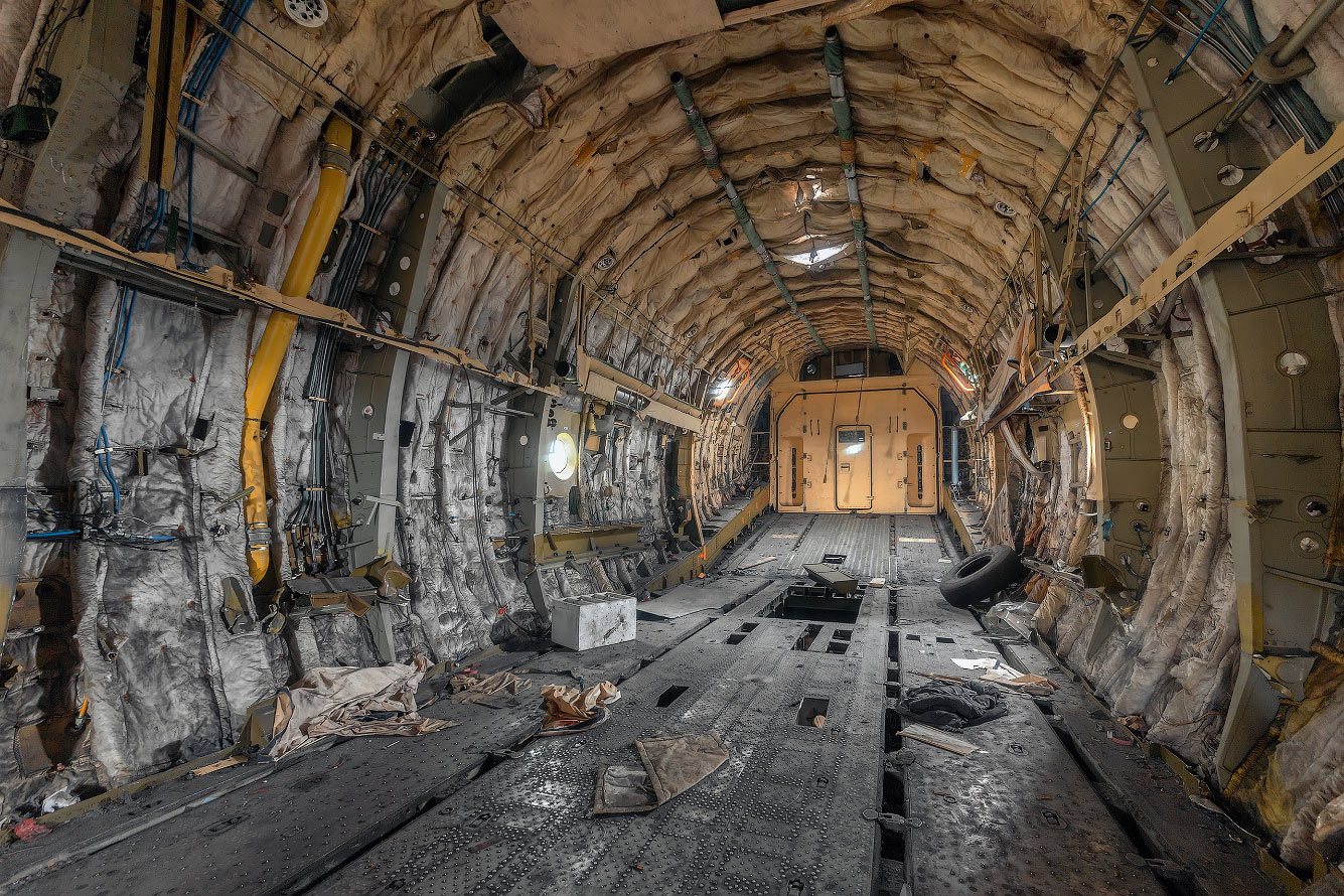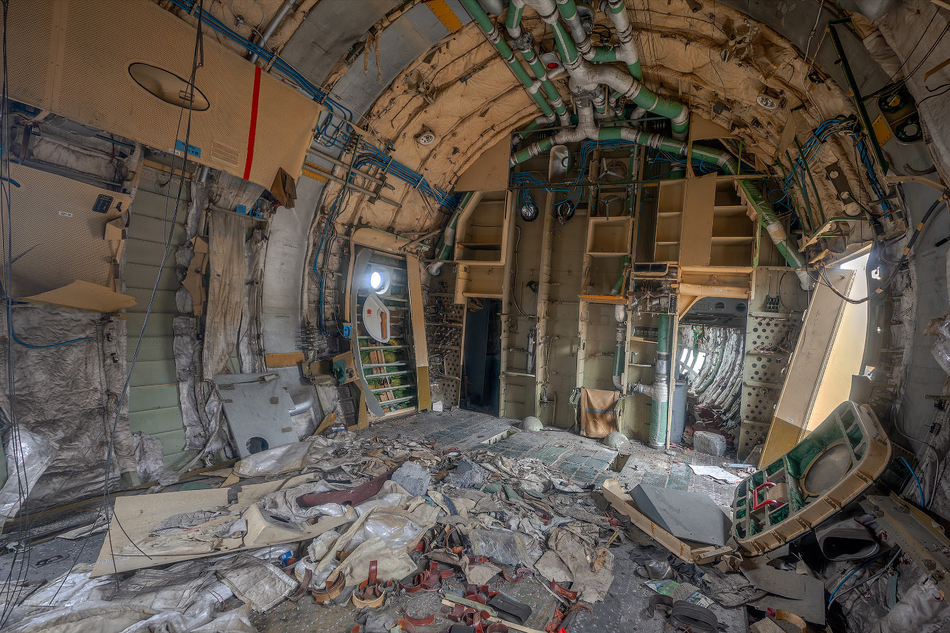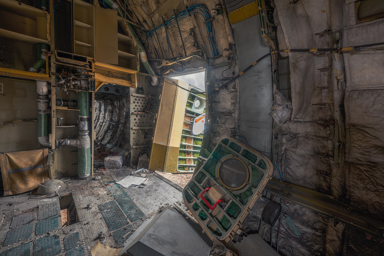 Технический отсек является частью кабины экипажа и он соединён проходом с кабиной лётчиков. Но в этом самолете для лётчиков уже ничего не осталось. Я ожидал, что оборудования в самолёте уже не будет, но то, что даже пол двухпалубного отсека утащат это было неожиданно.