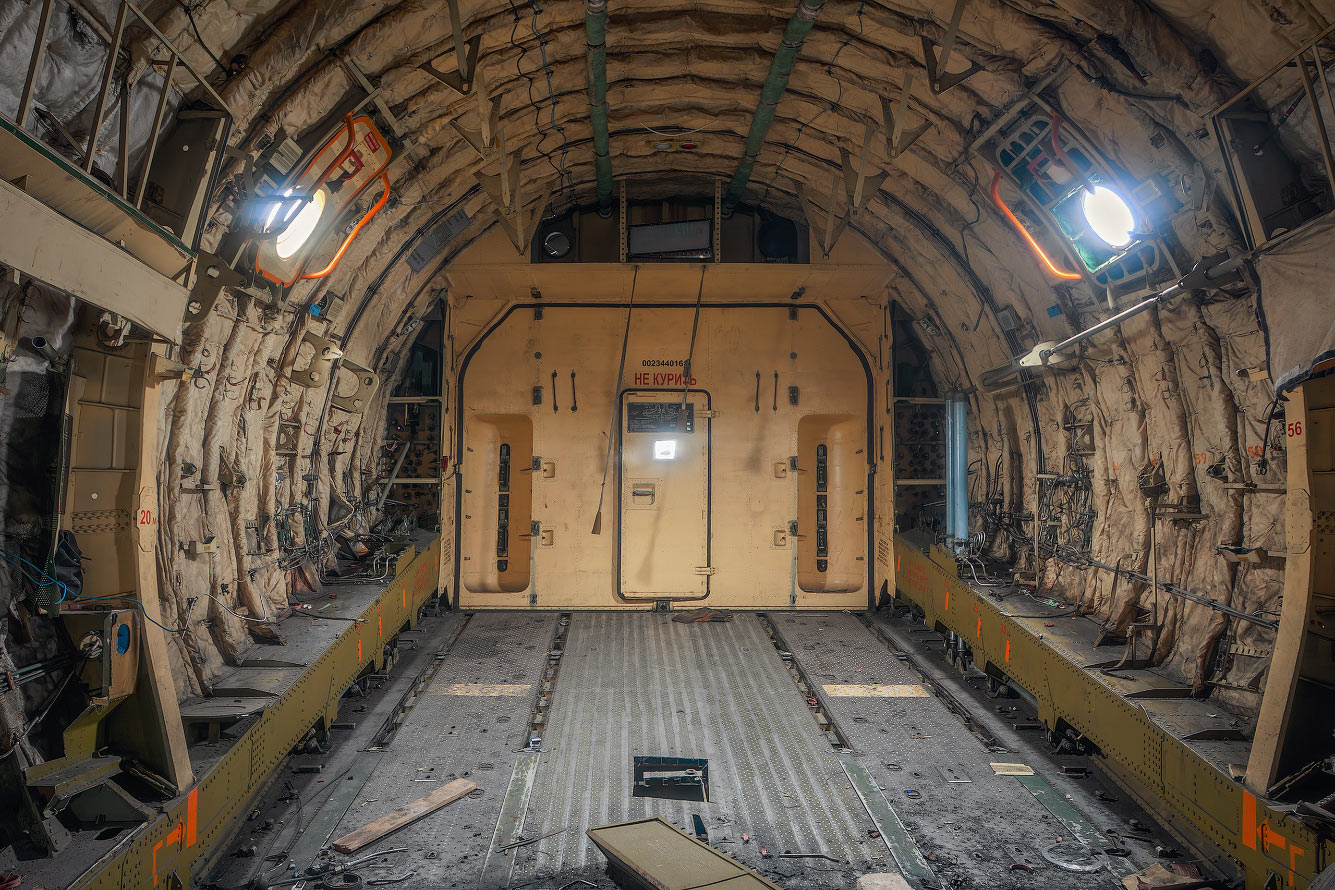 Увы, внутри царил бардак, но это не мешает оценить немалый размер грузового отсека. Ведь ИЛ-76 и его модификации относятся к типу тяжелых транспортных самолётов. Его длина вместе с рампой 24,5 метра, ширина 3,45 метра, а высота 3,4 м. Размеры были выбраны не случайно, они соответствуют стандартному железнодорожному габариту 02-Т. Что позволяет провозить крупногабаритные грузы и технику.