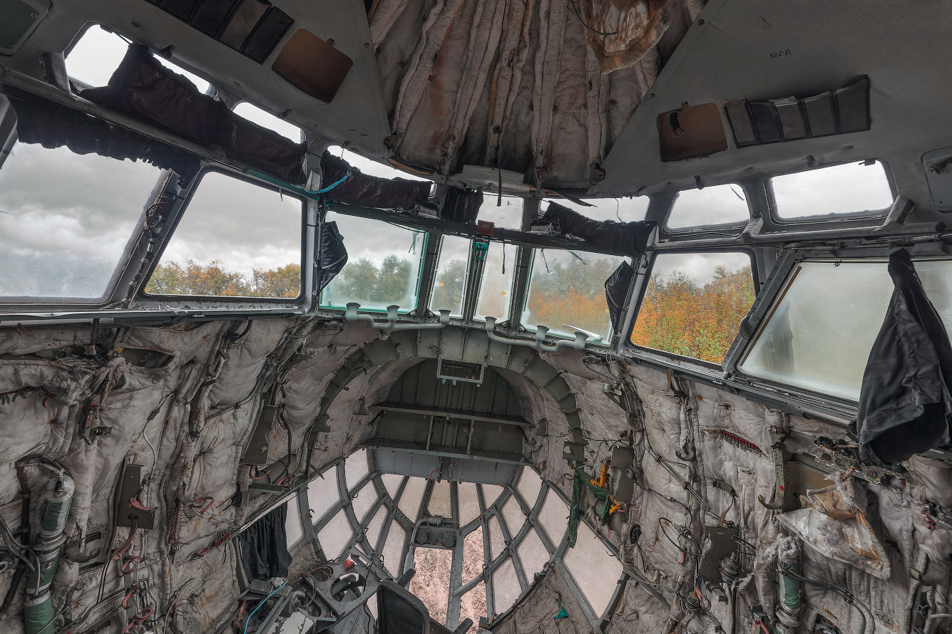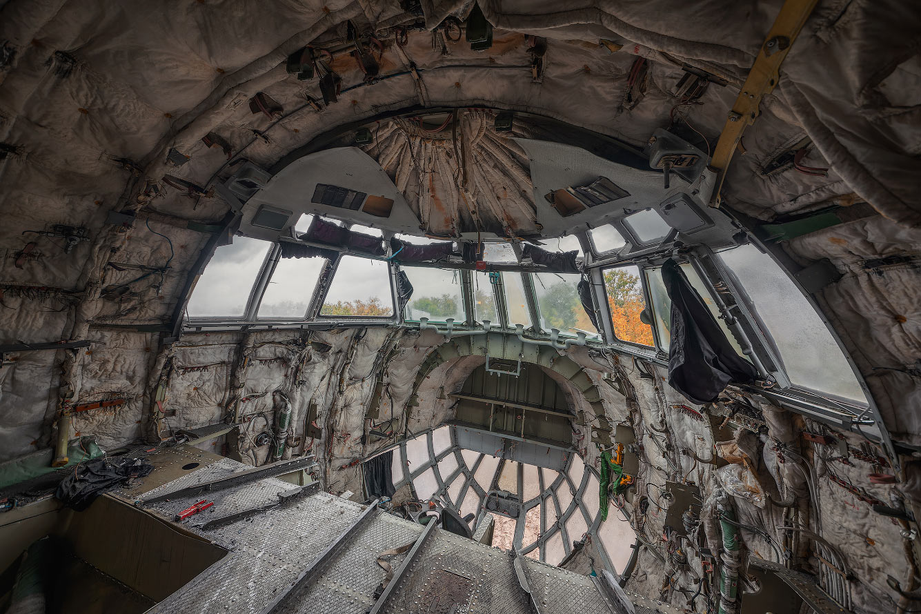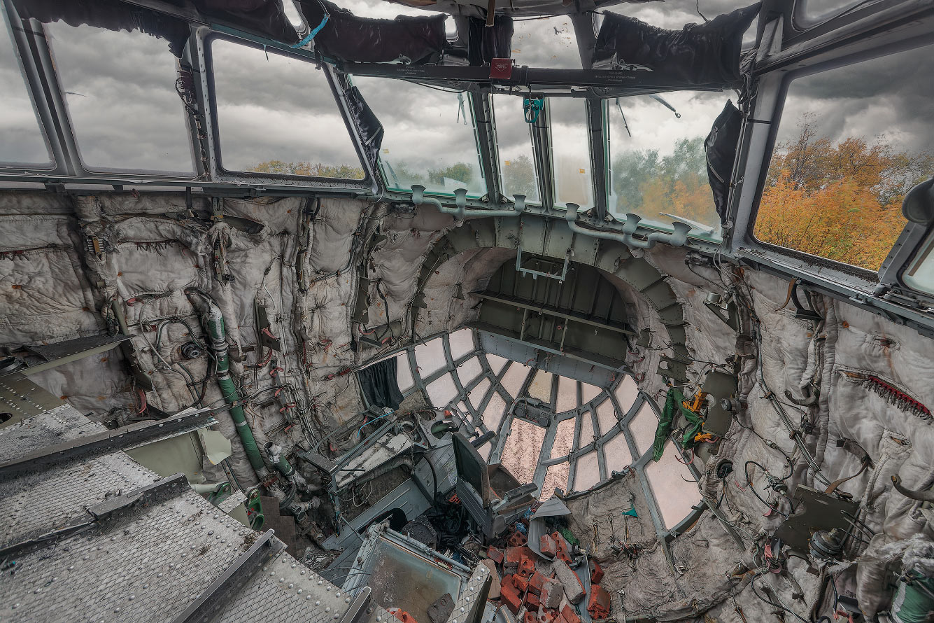На нижней палубе где когда-то была кабина штурмана осталось только кресло и… куча кирпичей. Зато получилось сделать уникальный снимок, когда на одном кадре внутри самолета, виден фонарь* кабины пилота и фонарь* кабины штурмана.