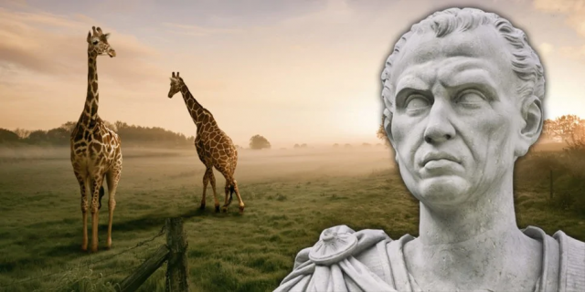 Самым интересным из них было странное существо с длинной шеей, наполовину верблюд, наполовину леопард (в представлении римлян) - жираф. Видя его покорность, римский историк Плиний предположил, что это, возможно, «дикая овца». Но самого Цезаря мало интересовала видовая принадлежность странного создания. Он скормил жирафа львам в своём Колизее на глазах у ликующей публики в знак своего богатства и великодушия.