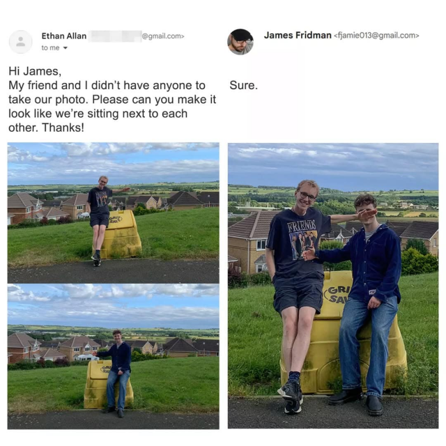 Мы с другом не нашли никого, кто мог бы сфоткать нас вдвоём. Сделай так, чтобы мы сидели рядом, пожалуйста
