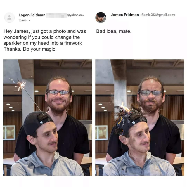 Есть такое фото, и я подумал, сможешь ли ты поменять бенгальский огонь у меня на голове на фейерверк. Спасибо. Прояви свою магию