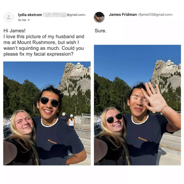 Люблю эту фотку с моим мужем у горы Рашмор, но я сильно щурюсь. Можешь исправить моё выражение лица?