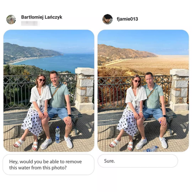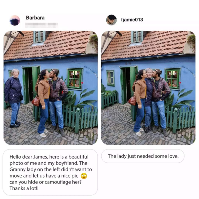 Это красивое фото со мной и моим парнем. Но из-за женщины слева снимок не такой удачный. Не мог бы ты спрятать её или как-то замаскировать?