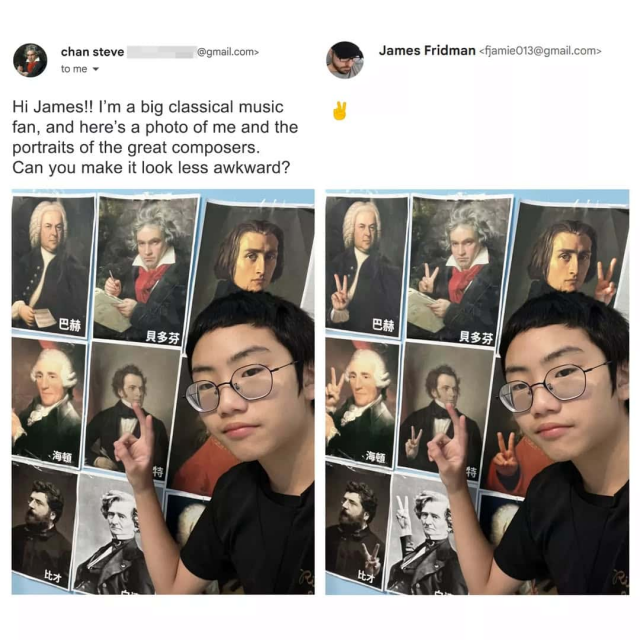 Я большой поклонник классической музыки, и вот фото со мной и портретами великих композиторов. Можешь сделать её менее неловкой?