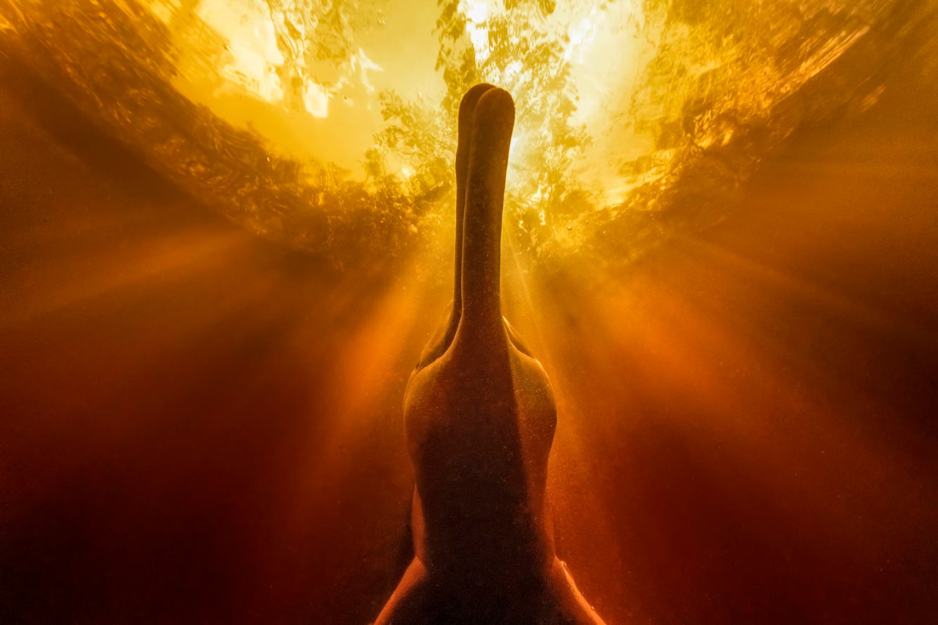 «Я провел две недели в Манаусе, где около 10 операторов кормят речных дельфинов, которые привлекают туристов. Мы посетили понтон с четырьмя местными бото и пляж, который привлекает около семи человек ежедневно. Бото выглядят очень необычно по сравнению с другими дельфинами, с невероятно длинными рострами — с рудиментарными волосками на них, крошечными глазами и толстыми телами. Идея здесь заключалась в том, чтобы попытаться получить неожиданный вид на удивительное животное, о котором большинство людей никогда не слышало». (Фото © Hussain Aga Khan / UPY2025):