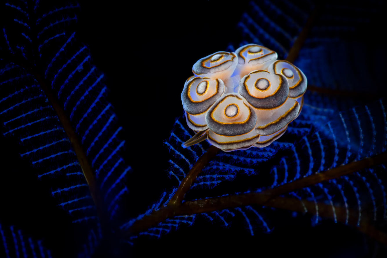 «Я хотел покинуть это вдохновляющее место с уникальным изображением Doto greenamyeri, одного из самых ярких объектов в Туламбене. Я создал драматический эффект свечения на голожабернике с помощью своей вспышки, подсветив гидроида-хозяина тонким голубым светом, чтобы сбалансировать композицию». (Фото © Bryan H. Blauvelt / UPY2025):