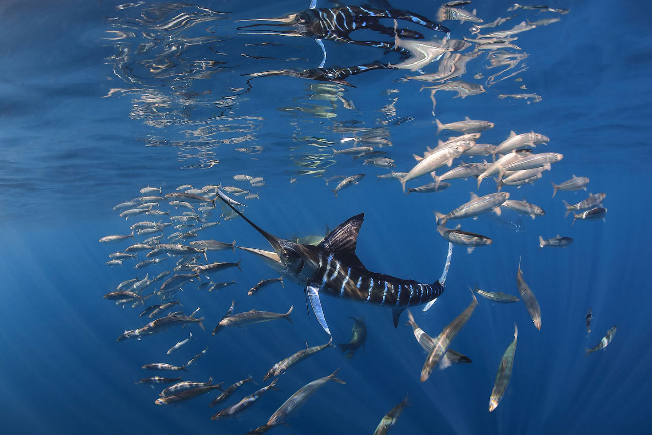 «Ноябрь-декабрь в заливе Магдалена в Нижней Калифорнии — лучшие месяцы, чтобы попытаться получить хорошие встречи с голубым марлином. Однако получить качественные снимки этой рыбы в дикой природе очень сложно, потому что они нападают на сардины и скумбрии на очень высокой скорости, что делает чрезвычайно сложным запечатлеть это поведение на фотографии». (Фото © Eduardo Acevedo / UPY2025):