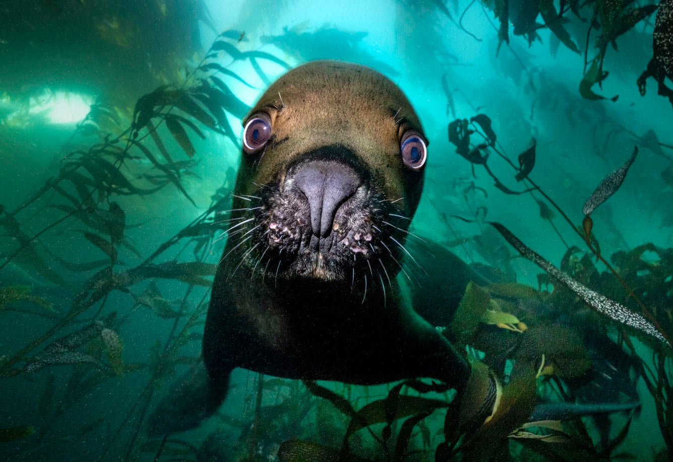 «Гигантские леса водорослей Фолклендских островов являются одними из самых пышных водорослевых амфитеатров в мире с холодной водой. Их колоссальная продуктивность поддерживает множество удивительных водных животных, включая этого буйного любопытного южноамериканского морского льва. Первоначально заинтригованные этим ярким морским лесом, спрятанным у архипелага Западный Фолкленд, мои товарищи по дайвингу и я быстро оказались в центре внимания проходящего прайда. Молодой самец с небольшими шрамами от отсутствующих усов, которые так напоминали юношеские прыщи на его лице, обращенном вперед, начал медленно свое расследование. А затем внезапно оказался прямо перед нашими лицами, тыкая, подталкивая и рыча, пытаясь выяснить, что именно это за пузырчатое чудовище лает у него на заднем дворе». (Фото © Patrick Webster / UPY2025):