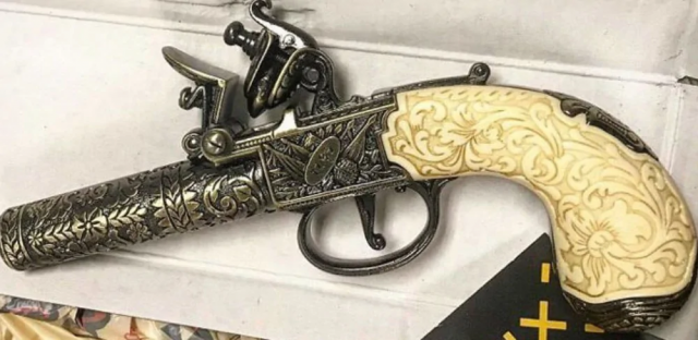 Старинный кремниевый пистоль, точнее, его современная копия — все же оружие. Просто так провозить нельзя.