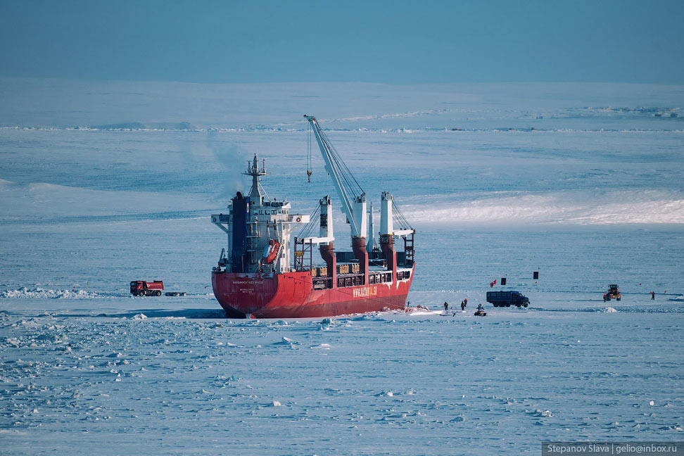 1. Ледовые причалы — по сути стоянки для судов посреди льдов, позволяющие оптимизировать многие процессы в условиях Арктики. Специалисты регулярно проверяют состояние и толщину льда, оценивают его крепость, целостность и способность выдержать многотонные грузы.
