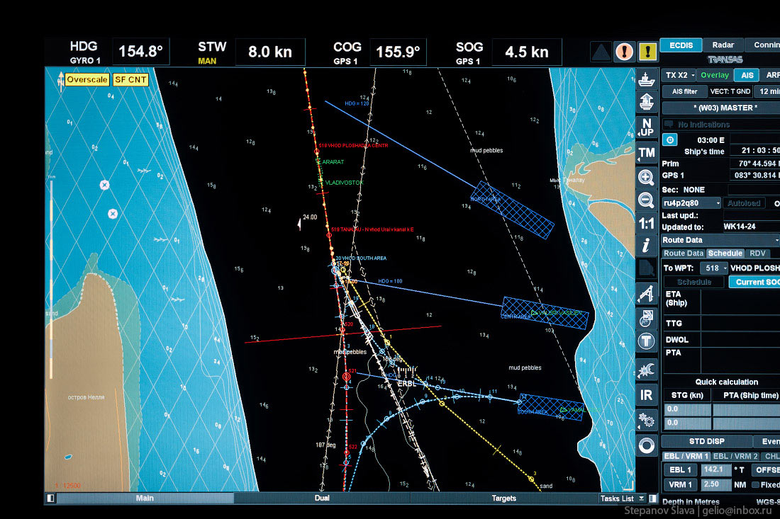 7. Когда всё готово, судно берёт разгон и начинает движение по каналу. Гидрологи, обеспечивающие организацию ледового канала, делают специальные прорези во льду под габариты судна исходя из его ширины равноудаленно с обоих бортов. Это нужно, чтобы надламывание льда шло по линиям вдоль бортов и образовывалась ровная кромка в точке совершения грузовых работ, по которой грузовики смогут подъехать вплотную к борту судна.