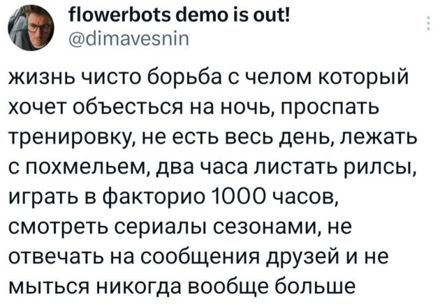 💬 Твиты, которые сделают вечер лучше 14/04/2025 19:00 Свежачок из X (а может, уже снова Twitter?) — про жизнь, любовь, пробки, кошек и то, как мы пытаемся справиться со взрослой жизнью. Кайфуйте и делитесь! Главная / Картинки +2 Admin 0 161