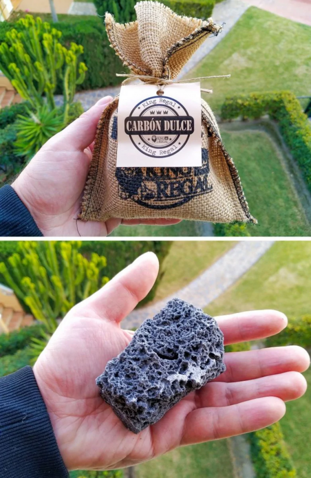 Один из испанцев подарил мне это на Рождество. Это сладкий уголь, обычно его преподносят в качестве подарка на Рождество деткам. Им таким образом напоминают, что целый год себя нужно вести хорошо и примерно, чтобы заслужить достойный подарок. Этот уголь дарится в целях воспитания.