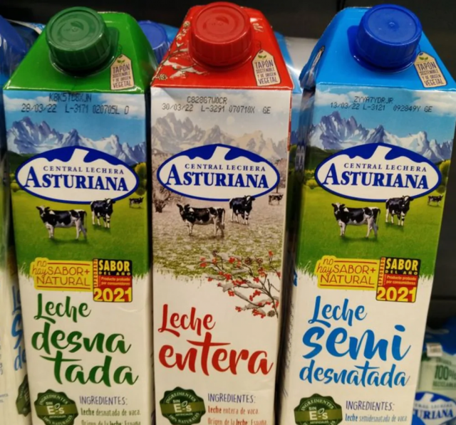 На русской молочной продукции обычно пишется процент жирности продукта. В Испании такого нет. Здесь все определяется по цвету. Пачка зеленым цветом обозначает, что молоко жирностью не больше 0,5 процентов, синим — 2 процента, красным — 4 процента.