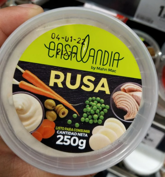 В Испании в магазинах можно купить вот такую баночку «Русского салата». Но на самом деле это не салат, а больше как закуска, которая имеет пастообразную текстуру. Продукт удобно намазывать на хлеб.