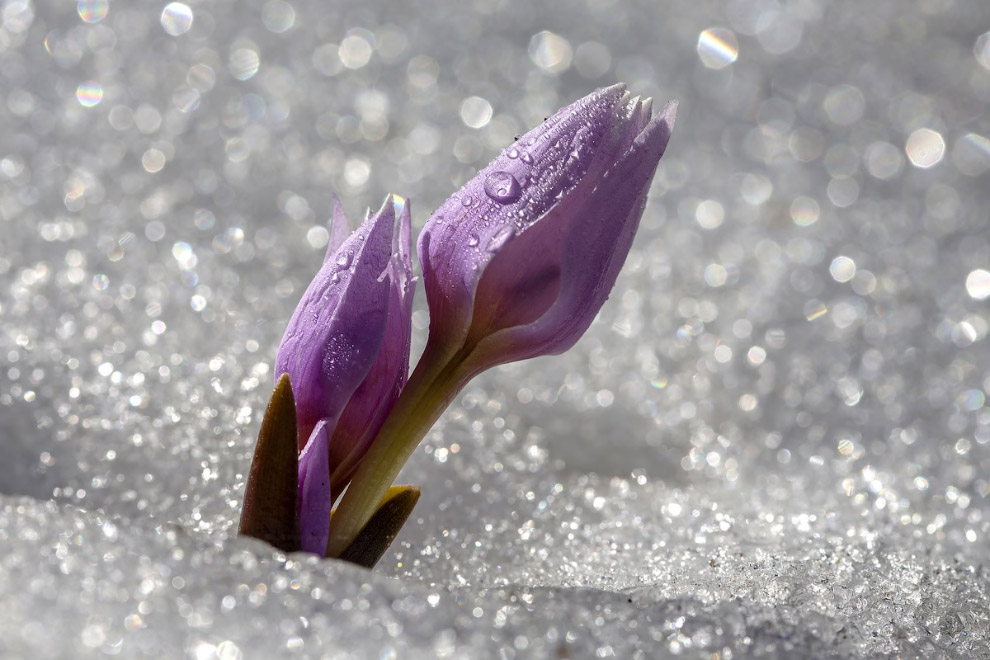 По мере повышения температуры в Улукёе, районе Батталгази в Малатье, Турция, снег начинает таять и появляются крокусы. Фото сделано 9 марта 2025 года. (Фото Байрам Айхан):