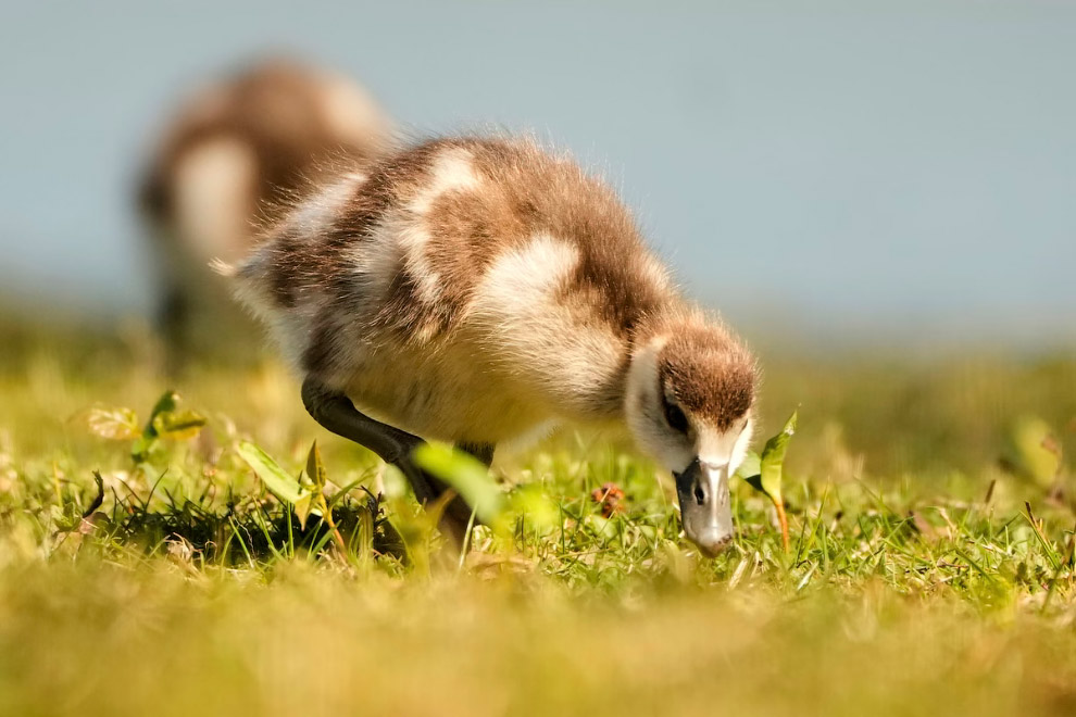 Молодые египетские гуси кормятся на лугу 5 апреля 2025 года в Гельзенкирхене, Германия. (Фото Мартин Мейсснер):