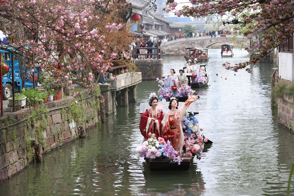 Вид с воздуха на цветущие абрикосы вдоль участка Цзянькоу Великой китайской стены в Пекине, Китай, 6 апреля 2025. (Фото Хао Цзихун):