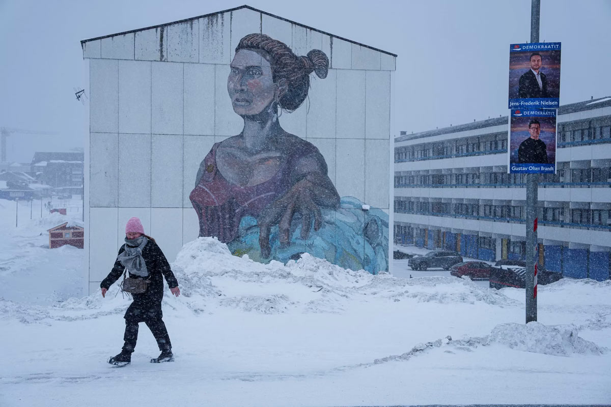 Женщина идет по улице мимо политических плакатов к предстоящим выборам в Нууке, 8 марта 2025 года. (Фото Evgeniy Maloletka):