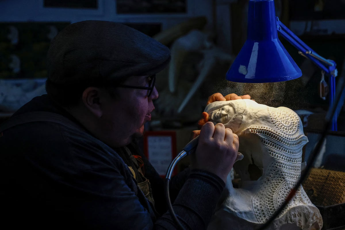 Резчик Клейст Эриксен работает над произведением искусства, изготовленным из черепа моржа, в своей мастерской в Нууке 12 февраля 2025 года. (Фото Sarah Meyssonnier):