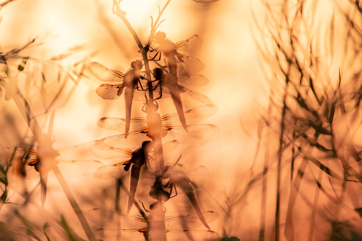«Каждый год в мае в RSPB Ham Wall происходит массовое появление стрекоз, и если вы приедете достаточно рано, вы сможете увидеть, как они гнездятся в камышах впечатляющими группами. Эта конкретная группа карабкалась по камышам, готовясь согреться, когда солнце поднимается над горизонтом. Чтобы создать ощущение неземности, я использовал двойную экспозицию в камере — один кадр был резко сфокусирован на объекте, а другой — с мягким фокусом, смешивая детали с атмосферой, похожей на сон». (Фото © Daniel Trim / British Wildlife Photography Awards):