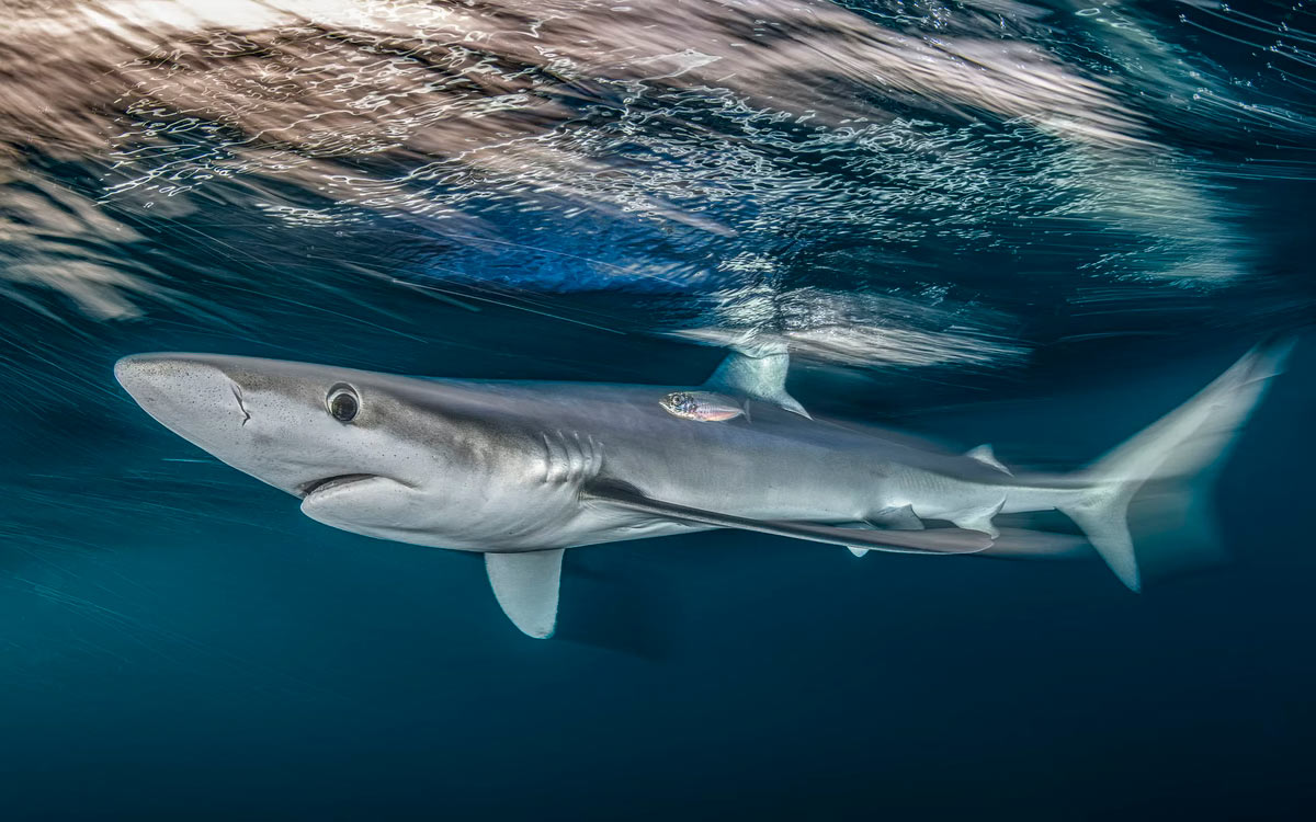 «Этот портрет синей акулы был сделан в 10–15 милях к юго-западу от Пензанса, Корнуолл. Синие акулы — летние гости в водах Великобритании, известные своей смелостью и любопытством, часто взаимодействующие с любителями подводного плавания. Они в основном питаются мелкой рыбой и кальмарами, и их легко привлечь к лодкам с помощью Rubby Dubby — смеси рыбьих тушек, жира и отрубей». (Фото © Nicholas More / British Wildlife Photography Awards):