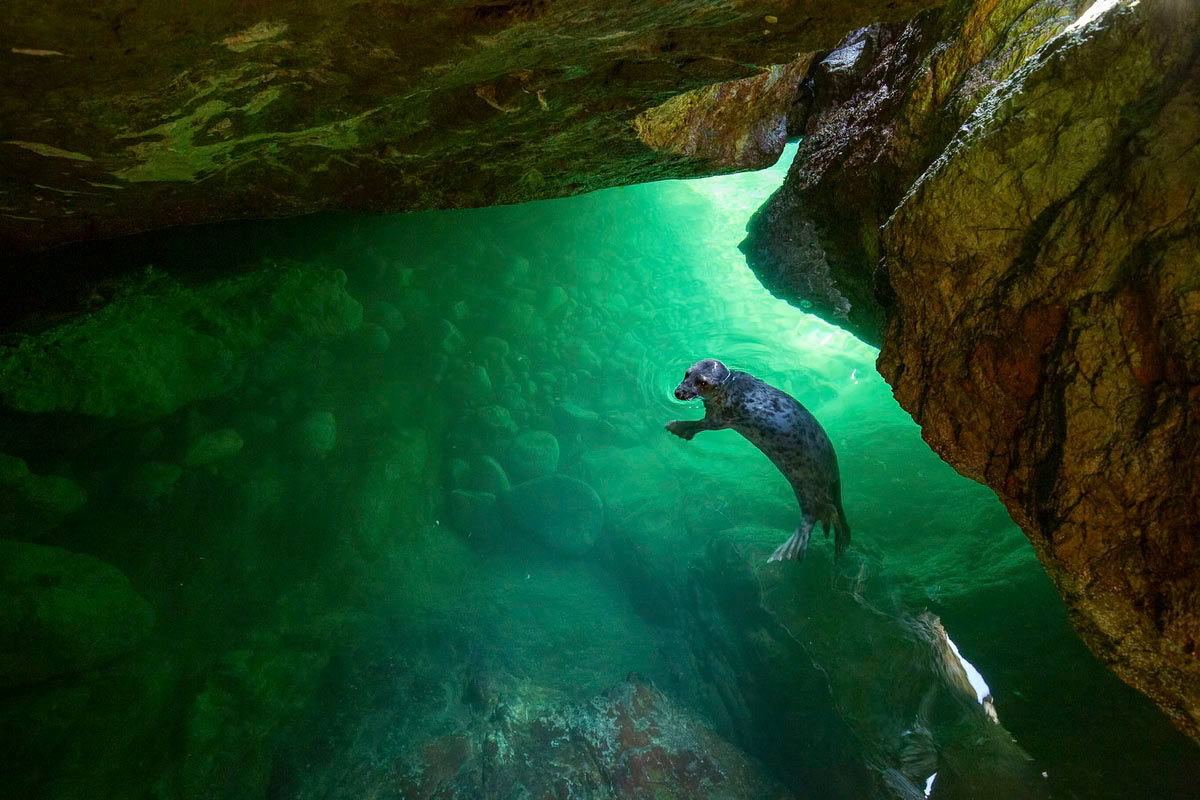 «Молодой серый тюлень выныривает на поверхность в прозрачных бирюзовых водах прибрежной пещеры на острове Бардси, Северный Уэльс. В этой пещере обитает до 30 и более тюленей, которые вылезают на поверхность из своих глубин, проникая в нее через скрытый под водой проход в сторону моря. Сидя спокойно наверху, можно понаблюдать за их движениями, поведением и замечательными вокализациями вблизи». (Фото © Ben Porter / British Wildlife Photography Awards):