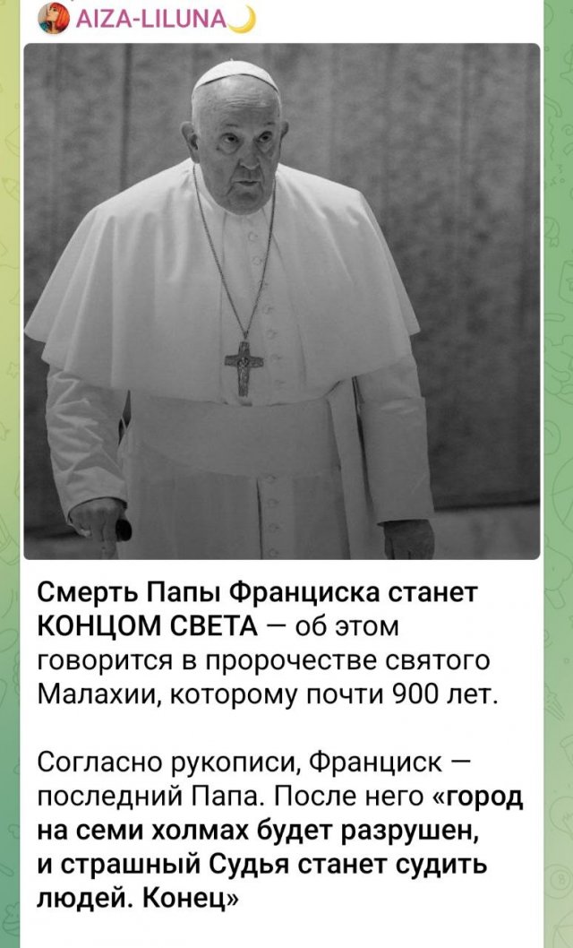 Уход из жизни Папы Франциска вернул интерес к мистическому документу, который приписывают святому Малахию - ирландскому епископу XII века. Речь идет о 900-летней книге «Пророчество о папах». Она состоит из 112 загадочных латинских фраз, которые якобы описывают каждого папу начиная с Целестина II в 1143 году.