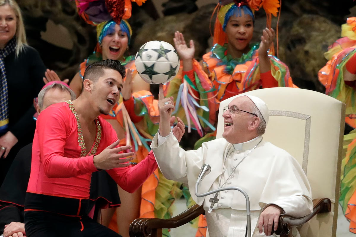 Папа Франциск крутит футбольный мяч, который был подарен ему членом Цирка Кубы во время его еженедельной общей аудиенции в зале Павла VI в Ватикане, 2 января 2019 года. (Фото Эндрю Медини):