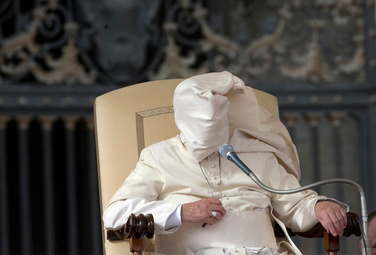 Порыв ветра во время его еженедельной общей аудиенции в Св. Площадь Петра в Ватикане, 5 ноября 2014 года. (Фото Алессандра Тарантино):