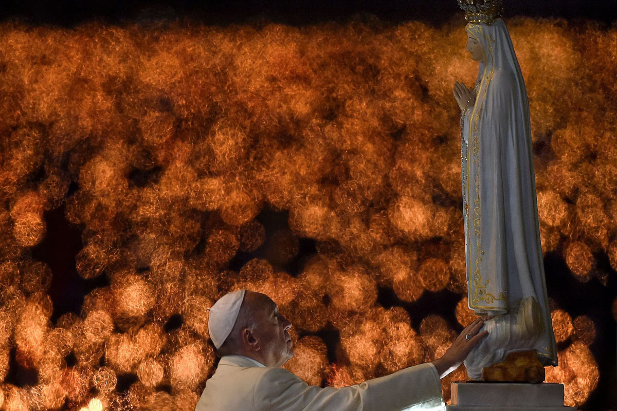 Ручные свечи горят на заднем плане, когда Папа Франциск прикасается к фигуре, представляющей Богоматерь Фатимы во время своего визита в Часовню Явлений в Святилище Фатимы, Португалия, 12 мая 2017 года. (Фото Патрисия Де Мело Морейра):