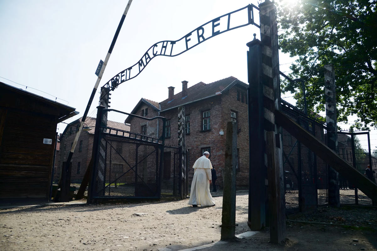Папа Франциск проходит через печально известные ворота Освенцима с надписью «Arbeit Macht Frei» («Работа освобождает вас») во время своего визита в бывший нацистский лагерь в Польше, 29 июля 2016 года. (Фото Филиппо Монтефорте):