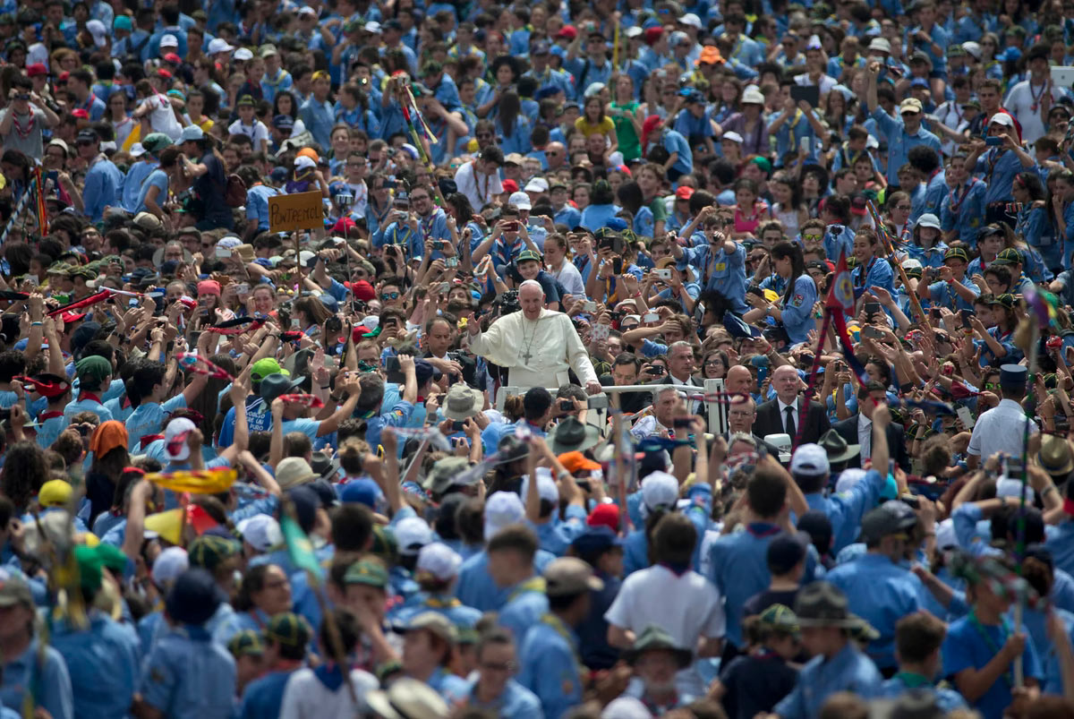 Папа Франциск приветствуется толпой, когда он прибывает на аудиенцию с членами Ассоциации итальянских католических гидов и скаутов в Сент-Стерле. Площадь Петра в Ватикане, 13 июня 2015 года. (Фото Алессандра Тарантино):