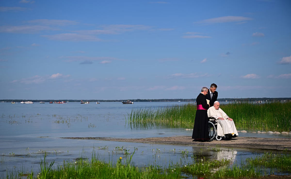 Папа Франциск участвует в Lac Ste. Анна Паломничество и Литургия Слова в Lac Ste. Энн, к северо-западу от Эдмонтона, Альберта, Канада, 26 июля 2022 года. (Фото Винченцо Пинто):
