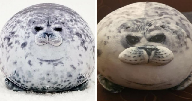 Подушка из плюша с изображением тюленя, которая была заказана. И её хмурый двойник, который пришёл